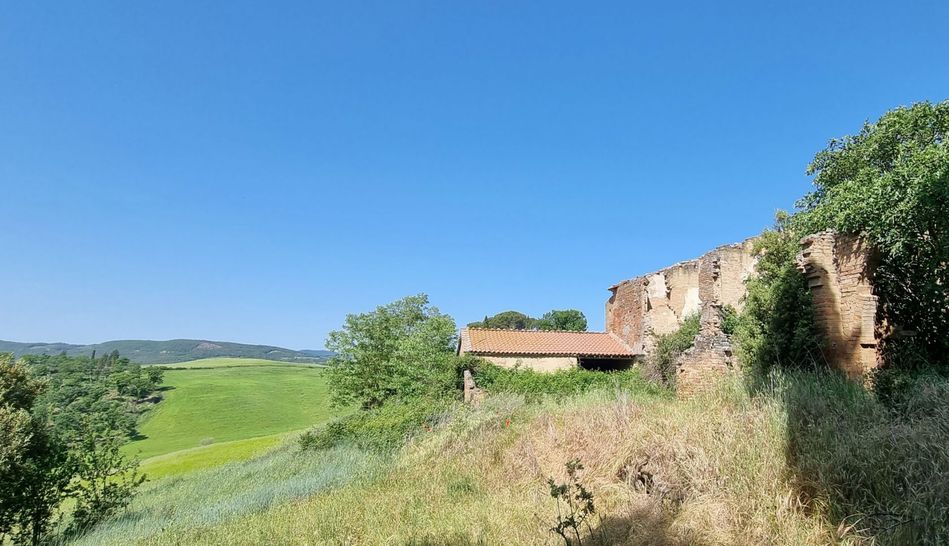 Ancient Tuscan farmhouse on the ridge of a hill with 360° views of the magnificent landscape characteristic of the Val d'Arbia (Montalcino, San Quirico, Torrenieri, Buonconvento, Serre di Rapolano, Siena and Murlo).