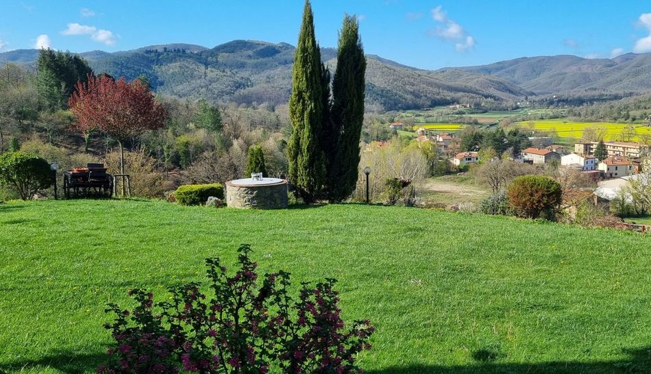 Renovated stone house a short distance from the center of a small town, the structure is part of the splendid green setting of a garden that surrounds the house.