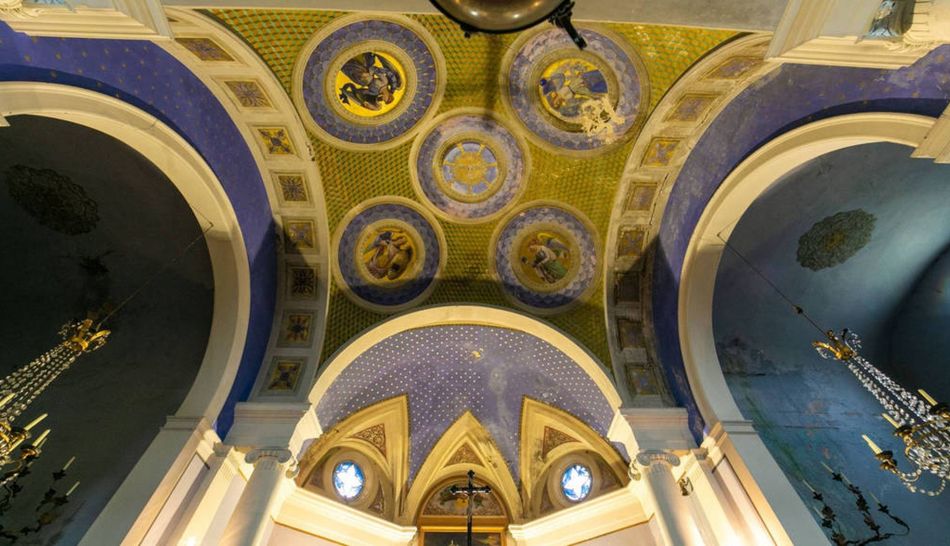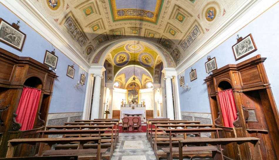 Passing through a small door hidden by plants and walking along the outer circuit of the wall, adorned with an ancient boxwood hedge, we reach a 'labyrinth'. The path, winding through a forest of holm oaks, is bordered by low laurel hedges and leads to the 'hermit's cave', St Benigno, protector of young women of marriageable age, whose remains are preserved in the villa's small church.