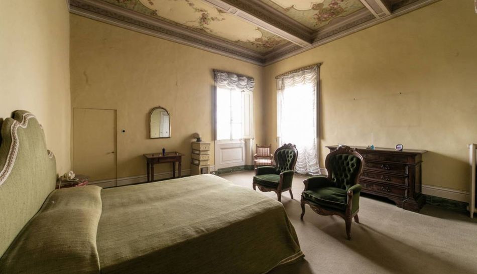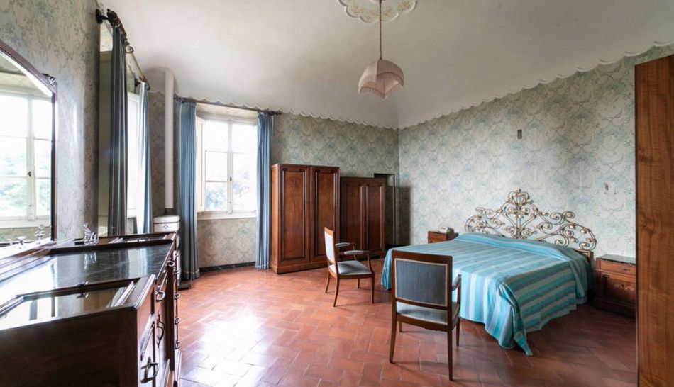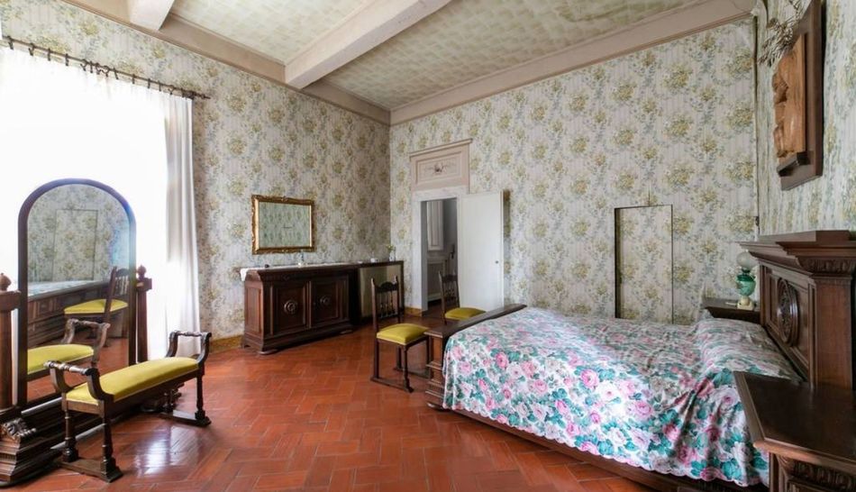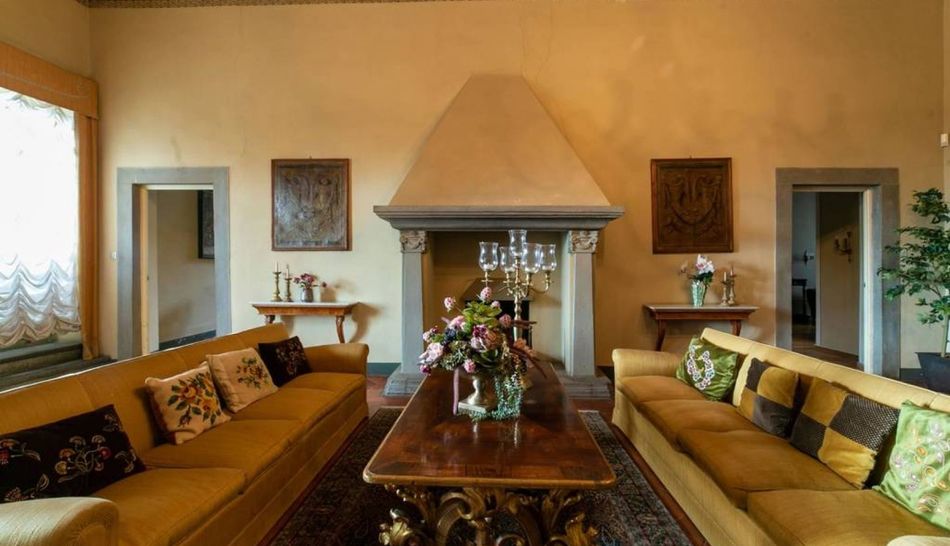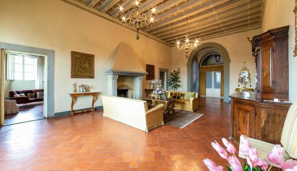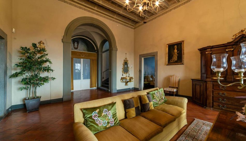 The ground floor is occupied by a large living room with a pietra serena fireplace and two adjoining rooms: the first is a very refined study, carved out of a chapel, while the second is a sitting room connected to a bathroom. The ante-bathroom, adorned with a tapestry with oriental motifs, is beautifully detailed.