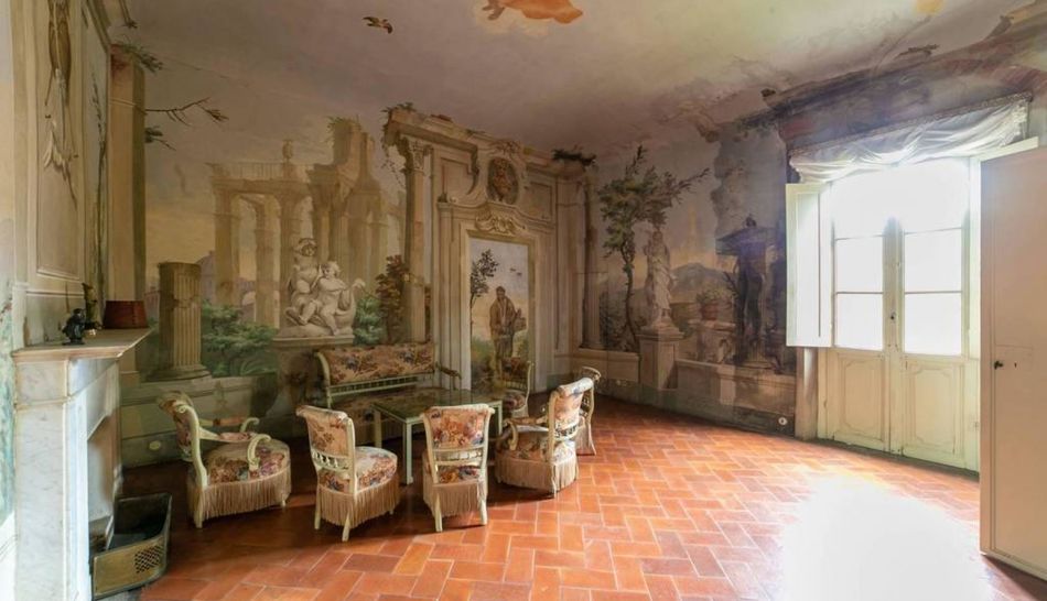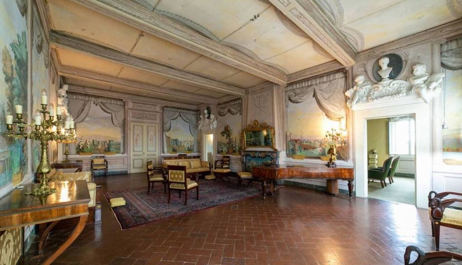 The main floor, accessed by two flights of barrel-vaulted pietra serena stairs, is truly splendid. The main hall, complete with a small balcony overlooking the valley and from which the towers of San Mianiato can be glimpsed, has its walls entirely frescoed with trompe-l'oeil paintings depicting the surrounding landscape. The effect of dematerialisation of the walls is very suggestive and is repeated in what is probably the most curious room of the villa. The salon leads, in fact, to the presumed room of Cristiano Banti, who probably intervened in its pictorial decoration.