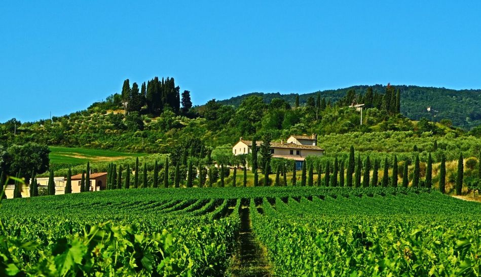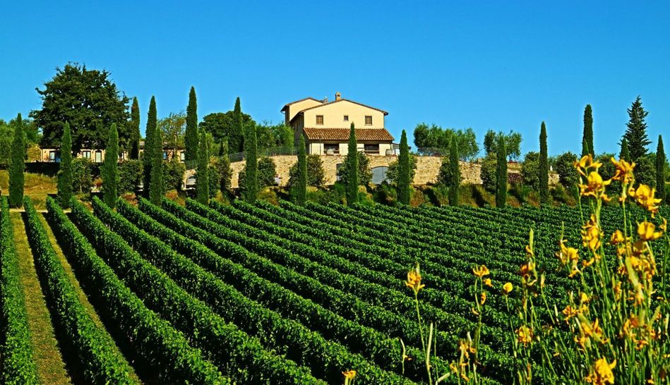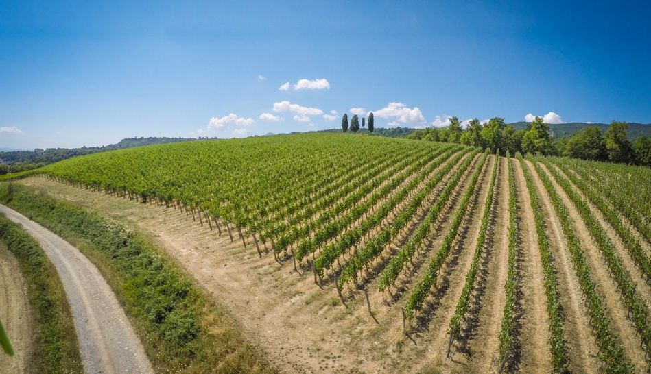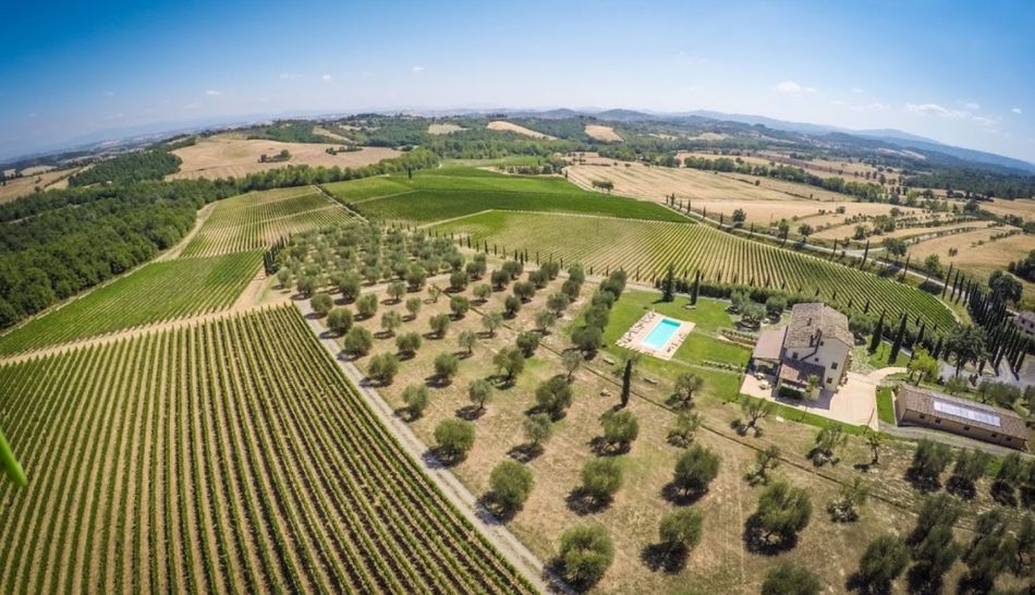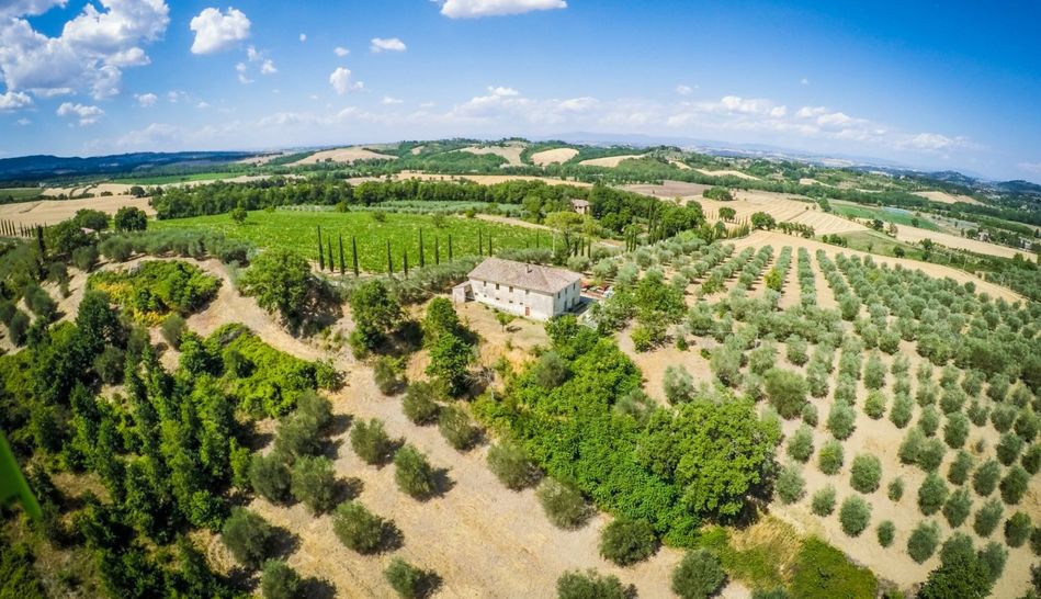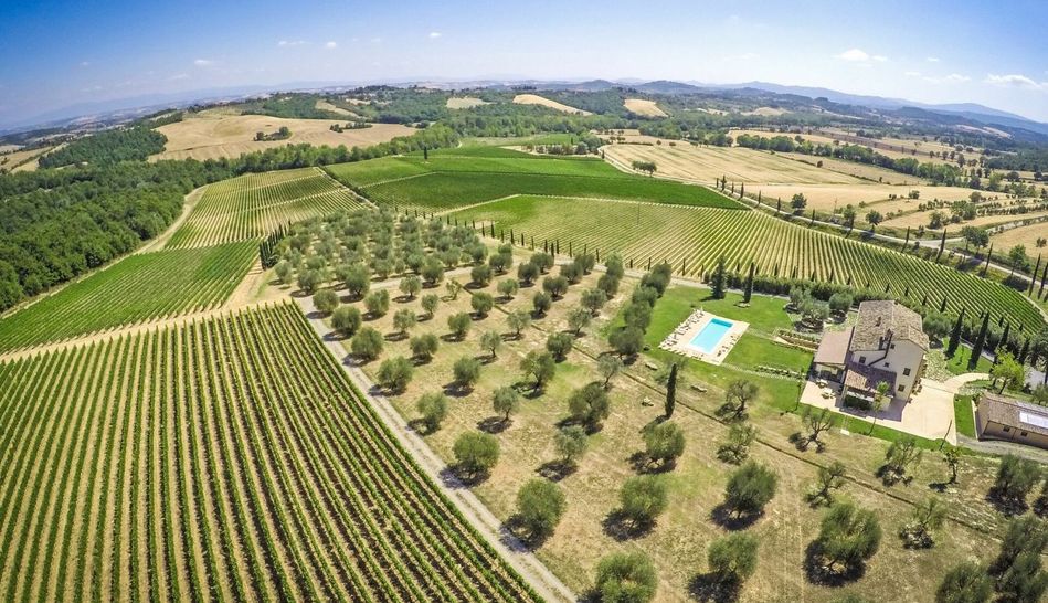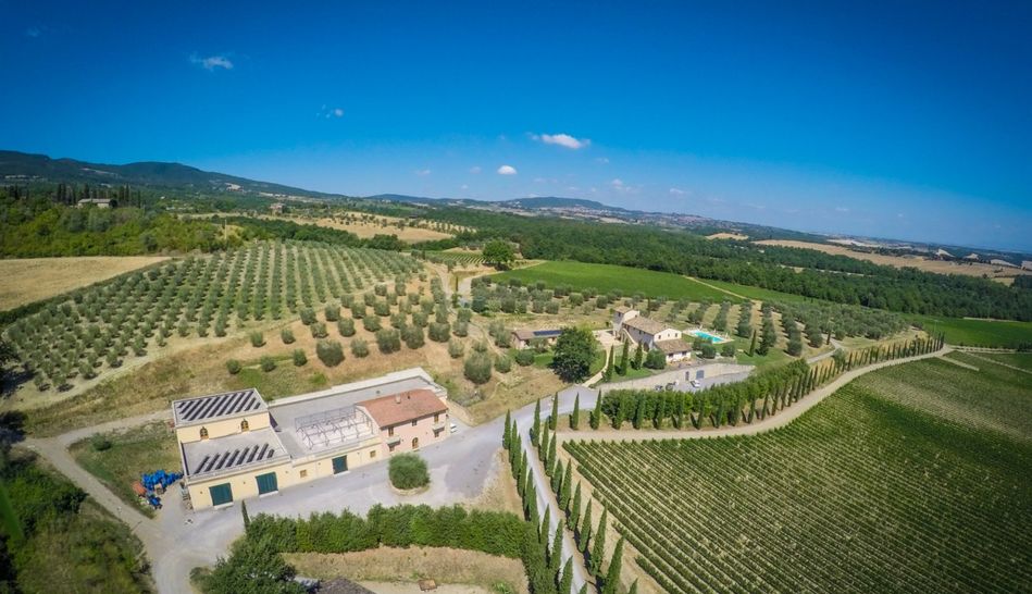 The vast land (about 125 hectares) that surrounds the property is divided between vineyards (25 hectares), olive groves (11 hectares), arable land (33 hectares) and forest (46 hectares, of which 5 of precious white truffle). Acquisition rights have been acquired for about 1.8 hectares of vineyards. Vineyard varieties: Merlot (26%), Sangiovese (25%), Cabernet Franc (16%), Pugnitello (6%), Malvasia (5%), Trebbiano (5%), Cabernet Sauvignon (5%), Syrah (3%), Petit Verdot (3%), Viognier (2%), Sauvignon Blanc (2%) and Verdicchio (2%). Annual production: theoretically there can be 250.000 bottles, effective on 100,000 (given that almost half of the grapes harvested are sold before winemaking). Stored product: about € 2,000,000 (bulk and bottled wine).