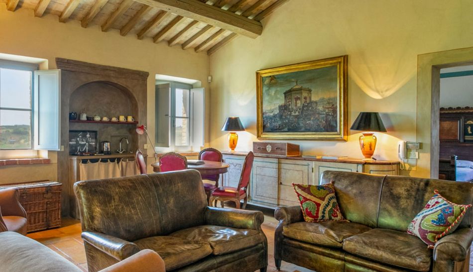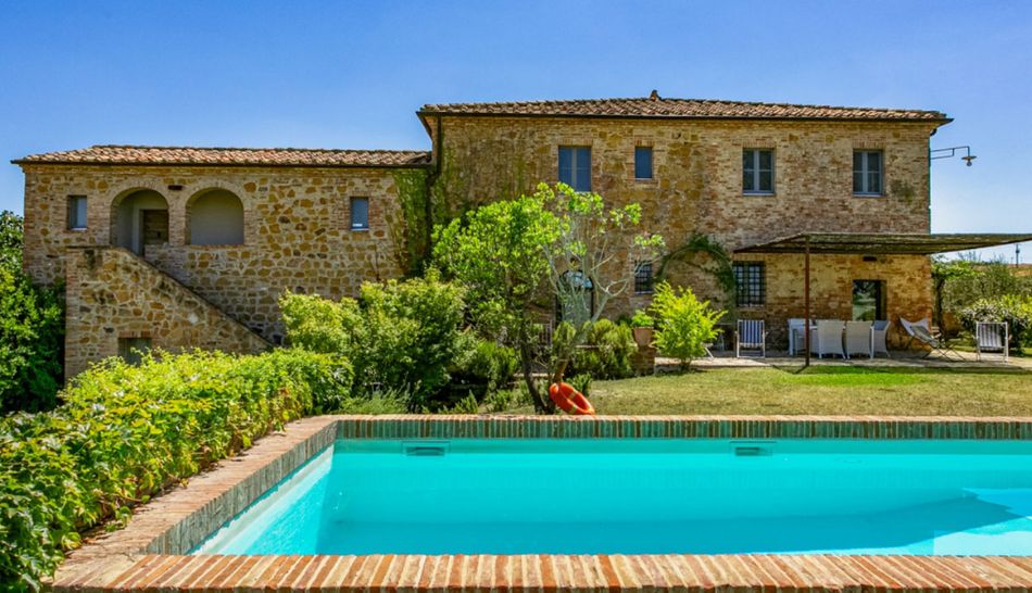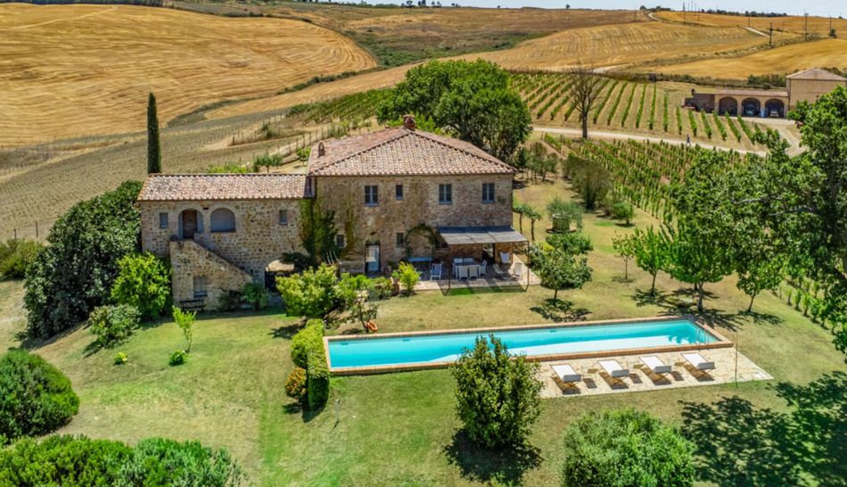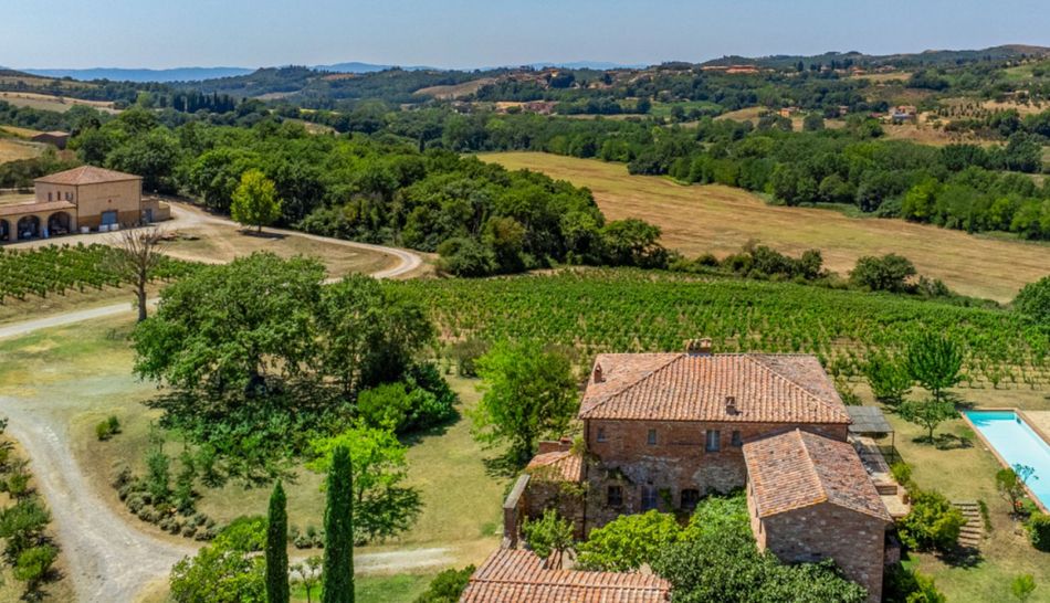 The sale includes about 12 hectares of land, of which 4 hectares are active in the production of high quality wine. The area of Montalcino and Montepulciano, famous for their vineyards.The perfectly restored farmhouse with typical Tuscan materials is composed on the ground floor from: Entrance with whitewashed beams and terracotta flooring, a bedroom, ensuite bathroom with shower and stone sink, large living room with fireplace and stunning views of the countryside and vineyards, kitchen with fireplace, an arcade delimiting the dining room, study service bathroom and closet.First floor: room with a delightful private loggia overlooking the vineyards, ensuite bathroom with shower and bathtub, winter living room with stone fireplace and small kitchen, bedroom and ensuite bathroom with bath and walk-in closet. Guest apartment consisting of bedroom and bathroom with shower. Independent suite with access from the loggia composed of a bedroom and ensuite bathroom with shower. Underfloor heating throughout the building.Outbuildings: Cellar with aging room, labeling and bottling room, warehouse, dining area for workers, kitchen, bathrooms, offices, changing rooms and office. Garage with tractor and equipment for the vineyards. Annexed Studio with courtyard, Apartment for staff, Traditional outdoor wood-burning oven.In front of the 20x4 swimming pool there is a covered outdoor seating area and an outdoor dining area is on the side of the villa.
