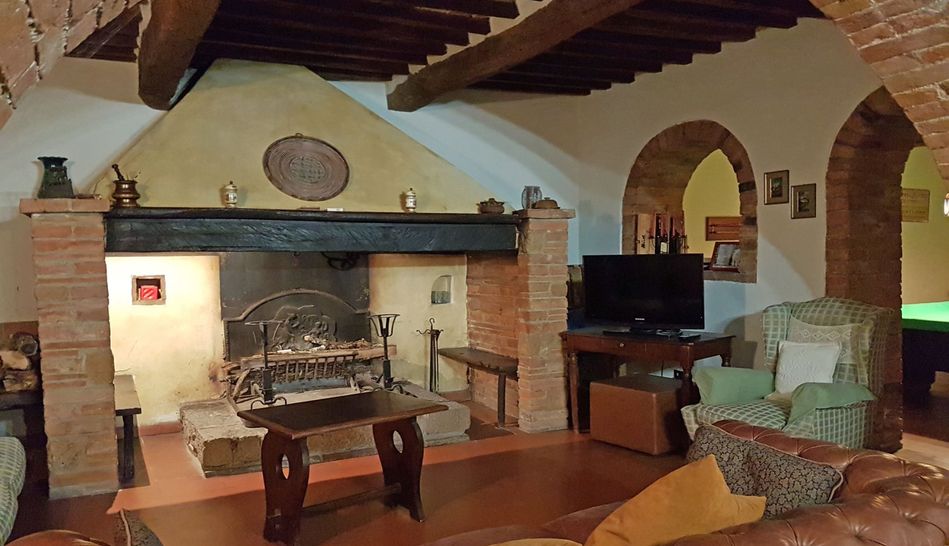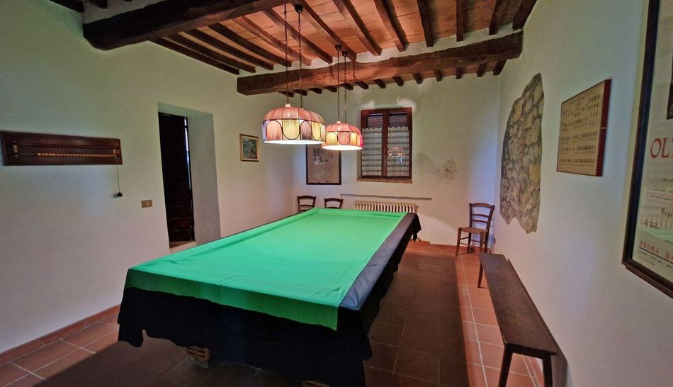 On the ground floor, accessing a large porch, there is a large living area with living room with fireplace, dining area, a large masonry kitchen with pantry and a billiard room. In one wing of the ground floor there is a small studio flat. On the ground floor there are also a wood-burning oven, a cellar, technical rooms and two large porches, one of which has a fireplace.