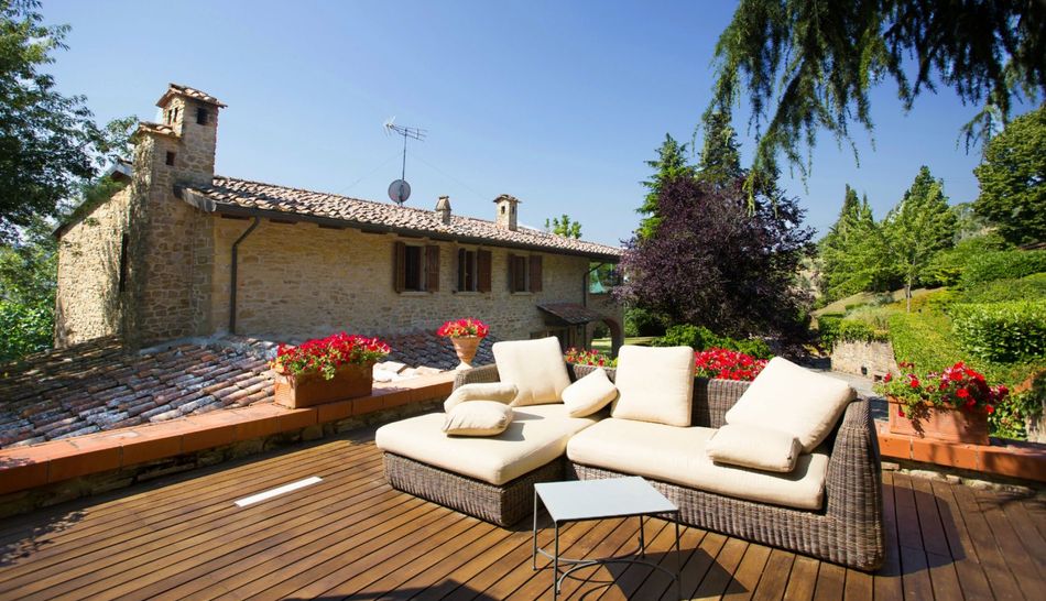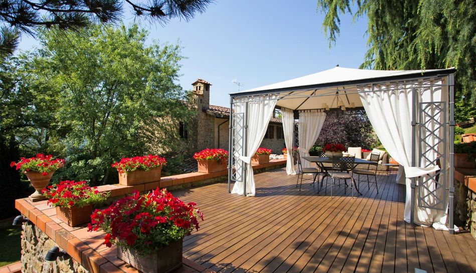 The stone house is equipped with porches, from which there is access to the barbecue and the wood-burning oven. From here there is also access to the large terrace equipped with a wooden floor, a gazebo, a table and a large sofa. In this area, which leads to the pine forest above, there is a Jacuzzi for 8 people.