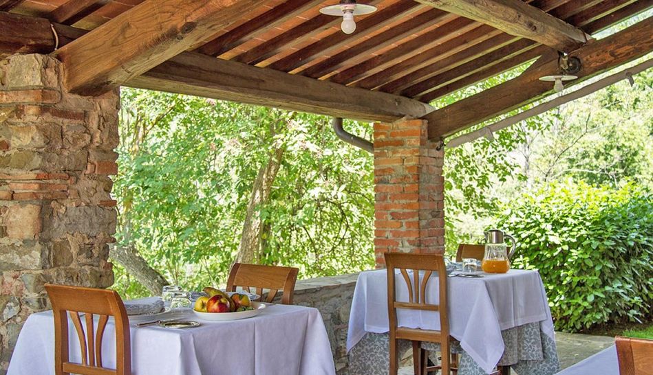 The hamlet includes five outbuildings, built in the Tuscan style with stone walls and wooden beams and currently used as storerooms, sheds, woodsheds and boiler room. The outbuildings feature two original 18th-century wooden ovens.