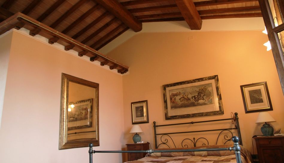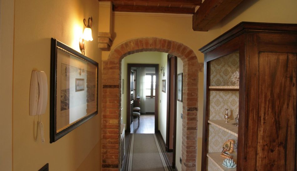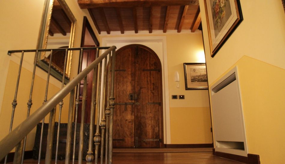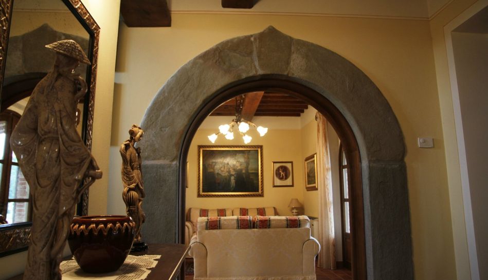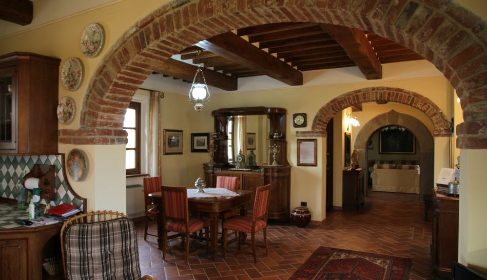 The stone and brick building covers an area of 300 sqm, beautifully restored in typical Tuscan style, with chestnut beams and terracotta bricks. The ground floor is characterised by large open spaces, where the kitchen, living room, study, laundry, pantry and bathroom are located. Also on the ground floor are two beautiful porticoes. The first floor consists of a hallway and three bedrooms with three respective bathrooms. Access to the first floor The first floor can be accessed via an internal staircase or an ancient external staircase in pietra serena.
