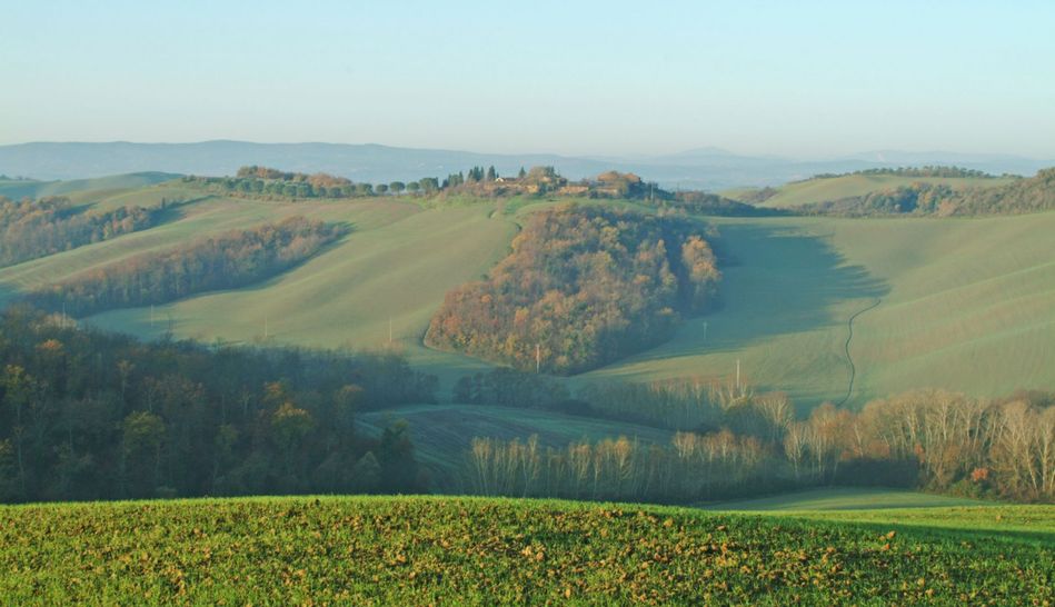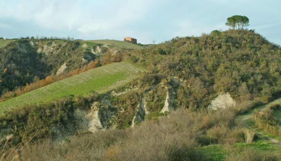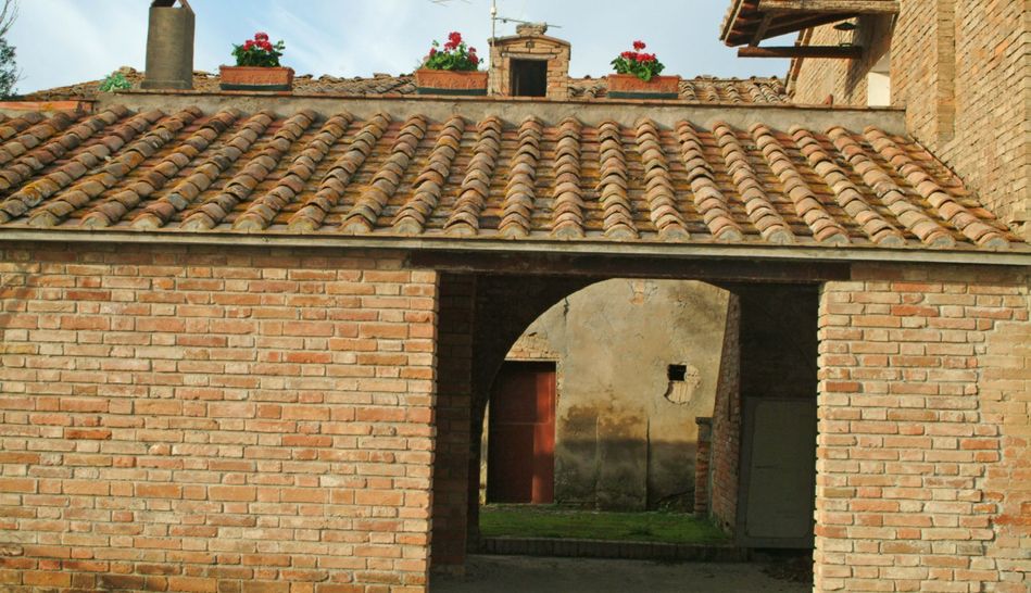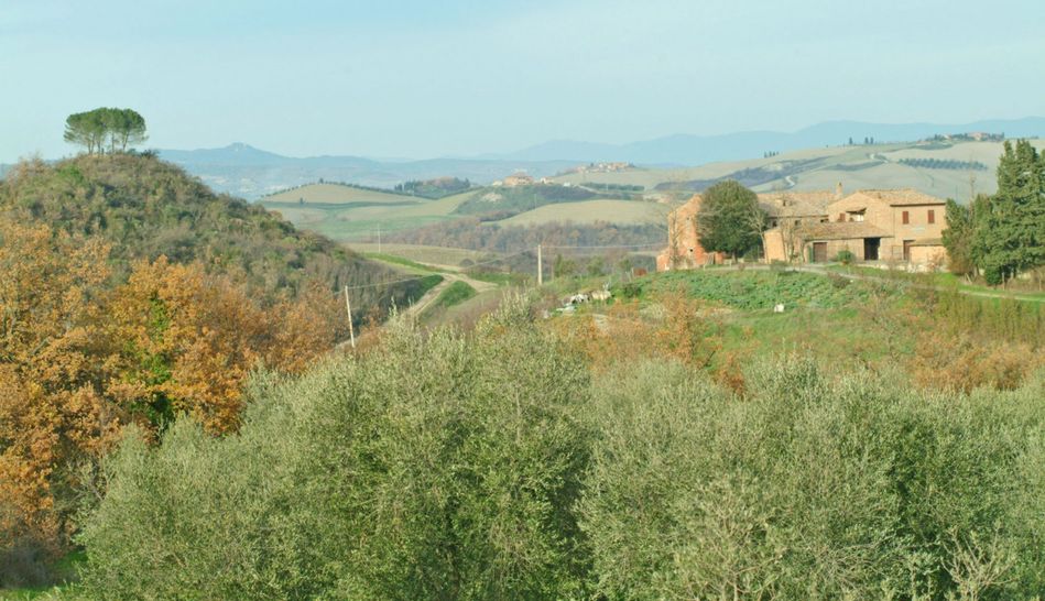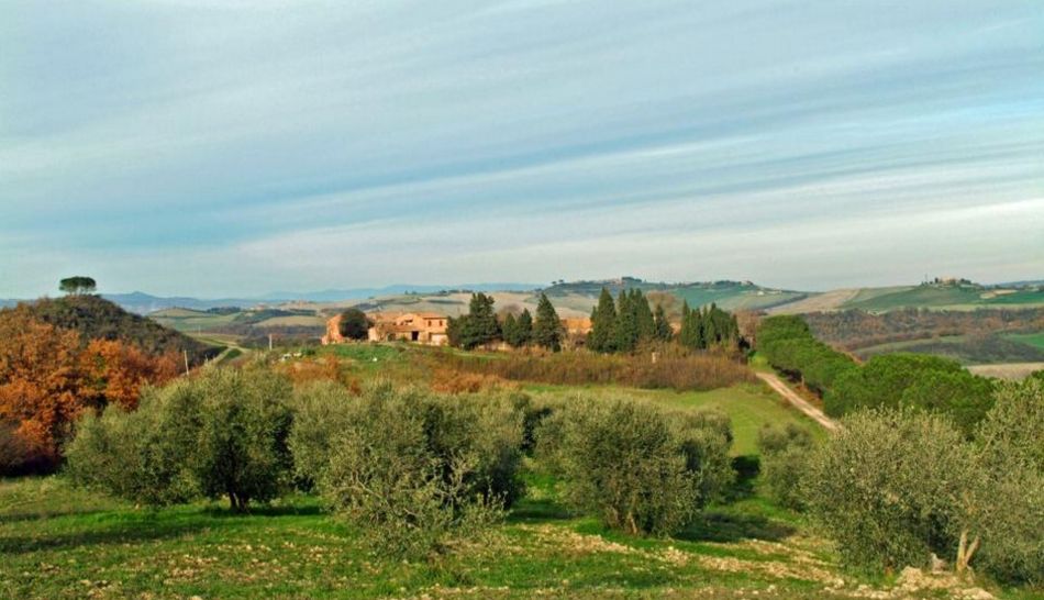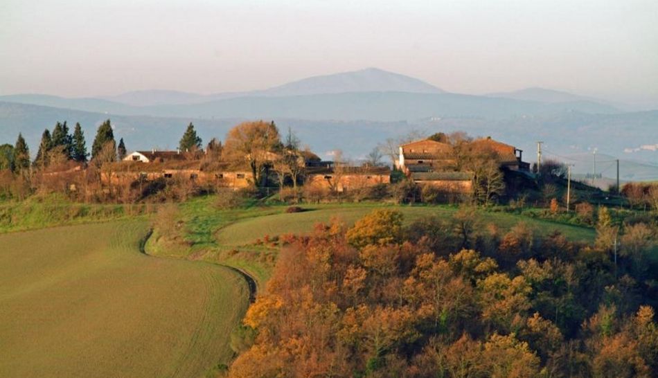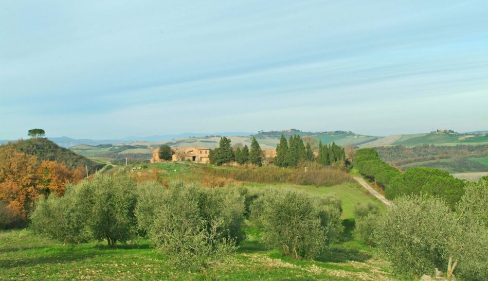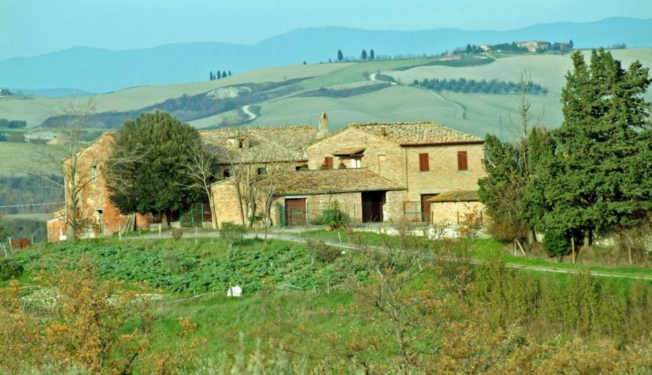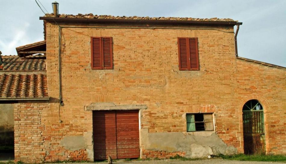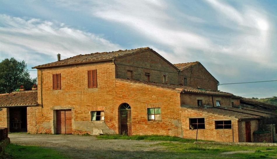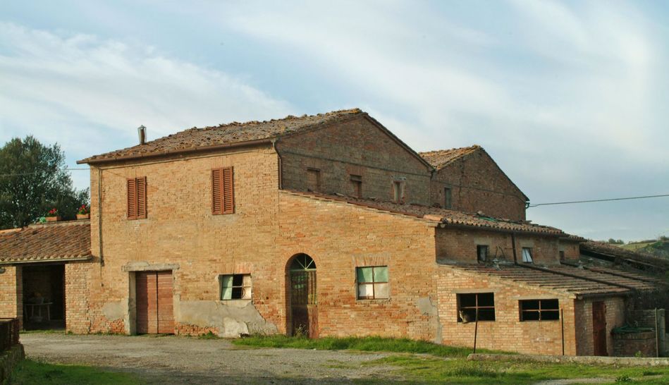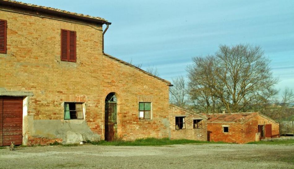 Asciano: On extremely panoramic location with great views overall the soft rolling hills of the Crete Senesi, on sale farm estate of about 2800 sq. meters with about 63 he of land.