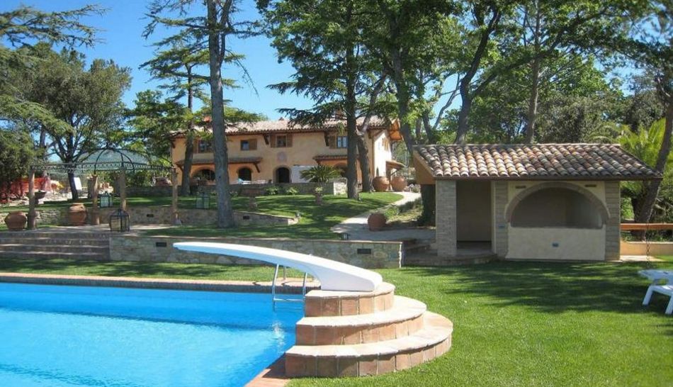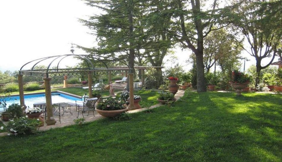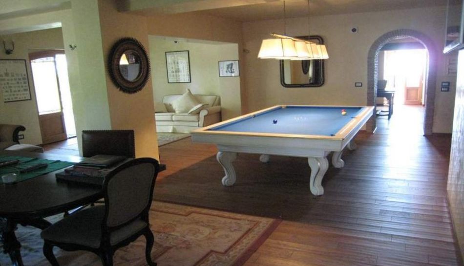 House: 340 square meters, four bedrooms and five bathrooms. In the basement are 28 square meters entirely occupied by the property cellars. The ground floor has a surface of 185 square meters and is composed of big and light filled rooms with access to the garden. It provides a cozy living room/ studio set in a very bright covered veranda, one kitchen with wood burning oven, one large dining room with fireplace, big living room with billiard, larder and one bathroom. The upper level covers an area of approximately 127 square meters and consists of four bedrooms each with private walk-in wardrobe, five neatly equipped bathrooms with shower and whirlpool bath. Large panoramic terrace.