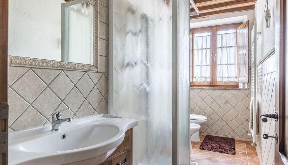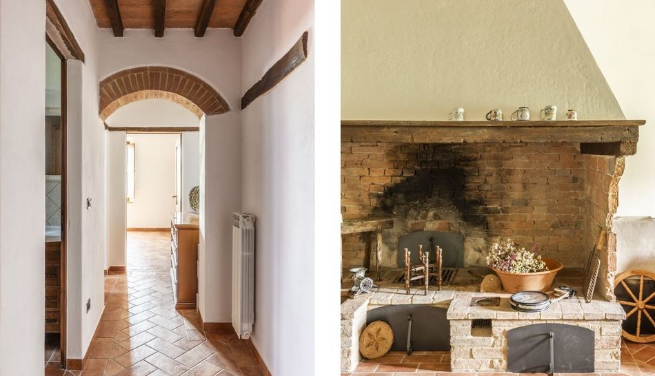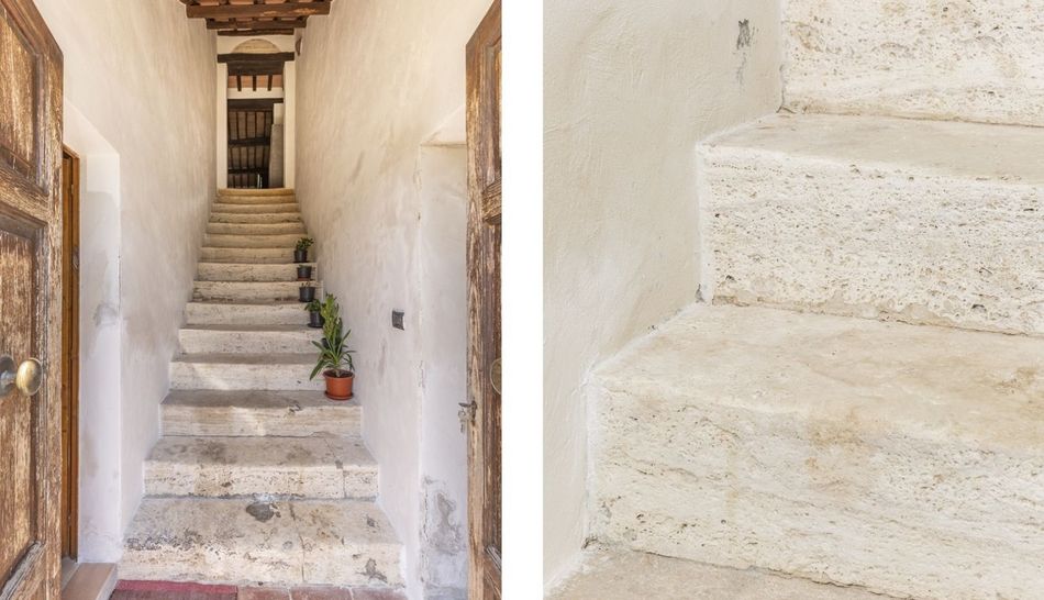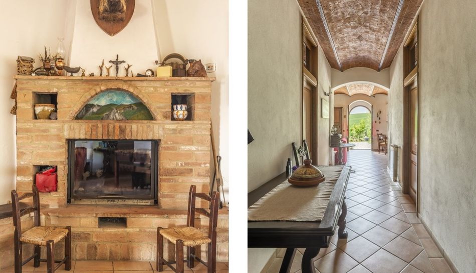 The first floor, accessible via a travertine staircase at the entrance of the farmhouse, houses the other two flats. The first flat consists of a living room with kitchenette and fireplace, two bedrooms with a loft, two bathrooms and a storage room. The second flat consists of a living room, a kitchen, two double bedrooms, one of which has a loft, and a bathroom.