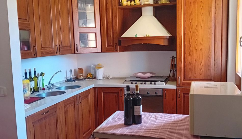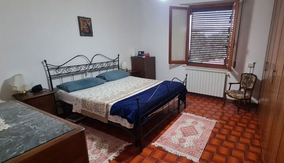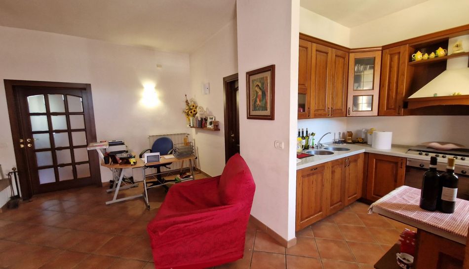 The ground floor, renovated in 2000, consists of a living room with kitchenette, two bedrooms (one with en-suite bathroom and the other with walk-in wardrobe), a bathroom with tub and a storage room. Also on the same floor, but with external access, there are a cellar and a small laundry room.