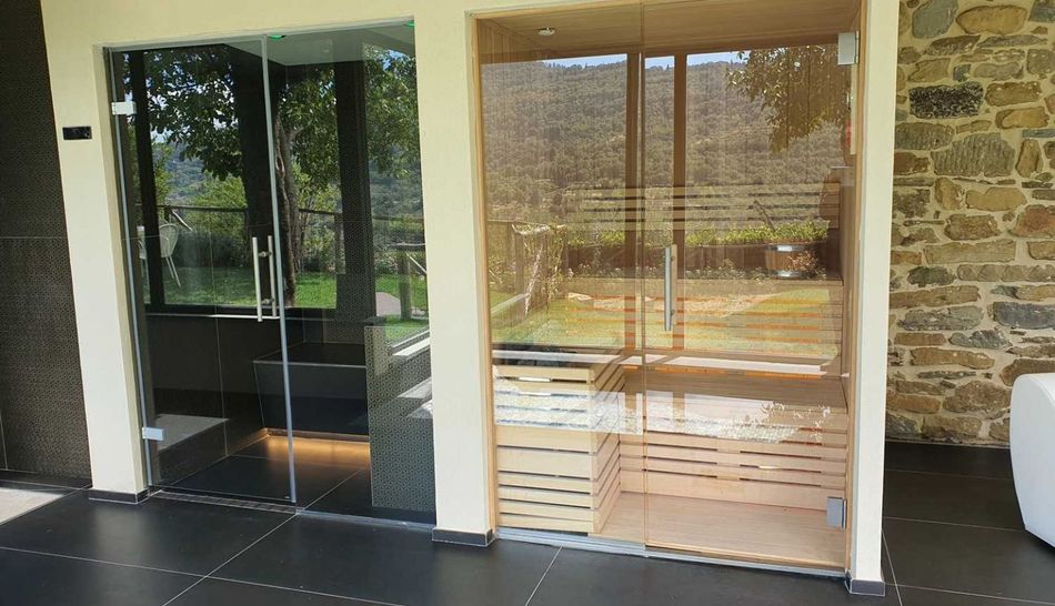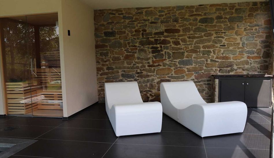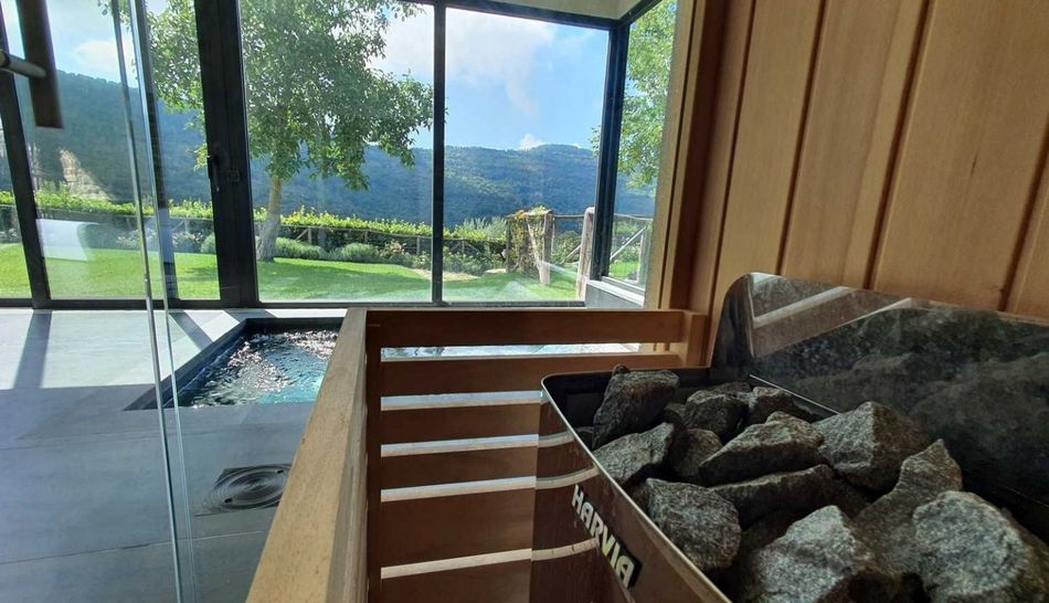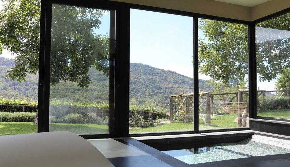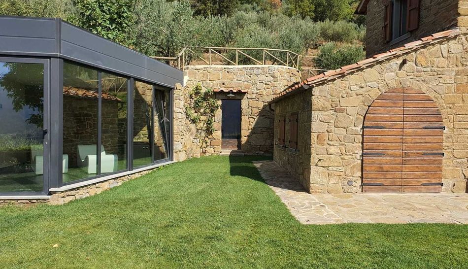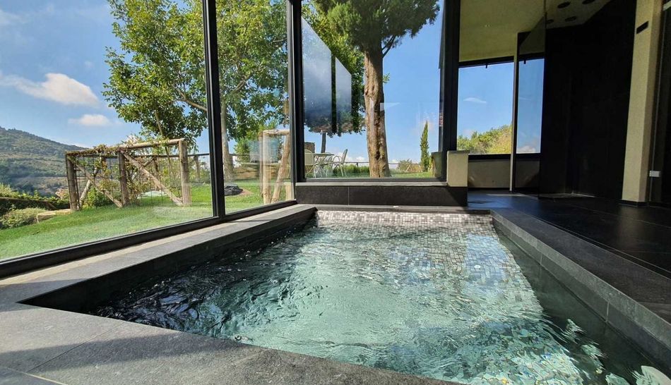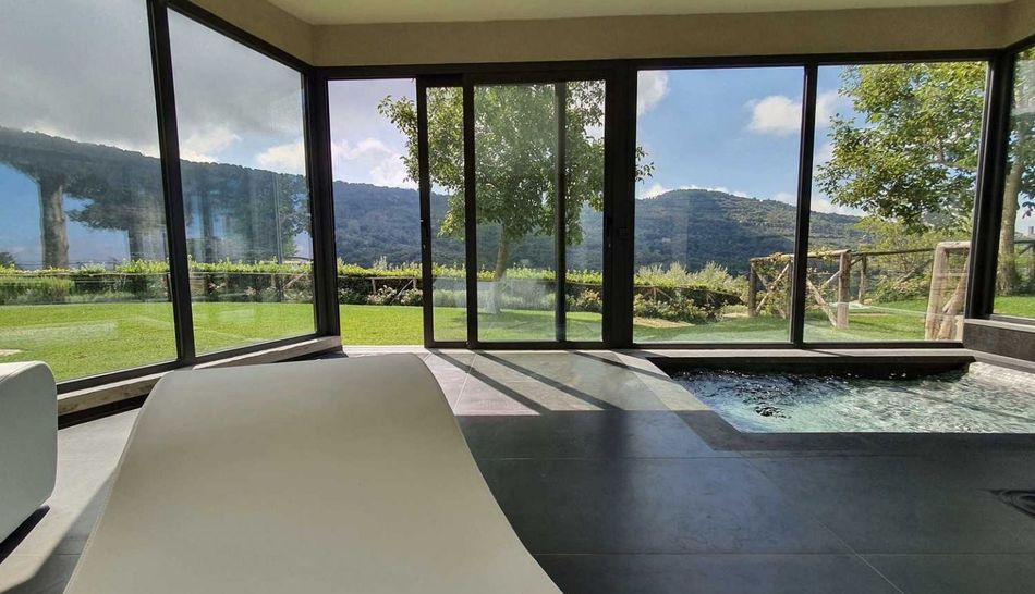 In addition to the spa, the farmhouse is completed by a lovely basement room next to the swimming pool, where a characteristic fifth room with bathroom and direct views of the park has been created.