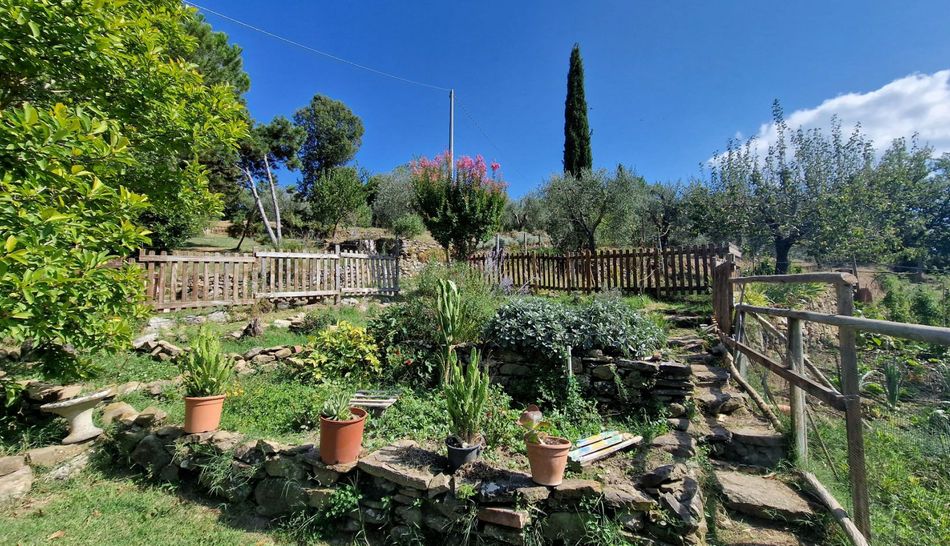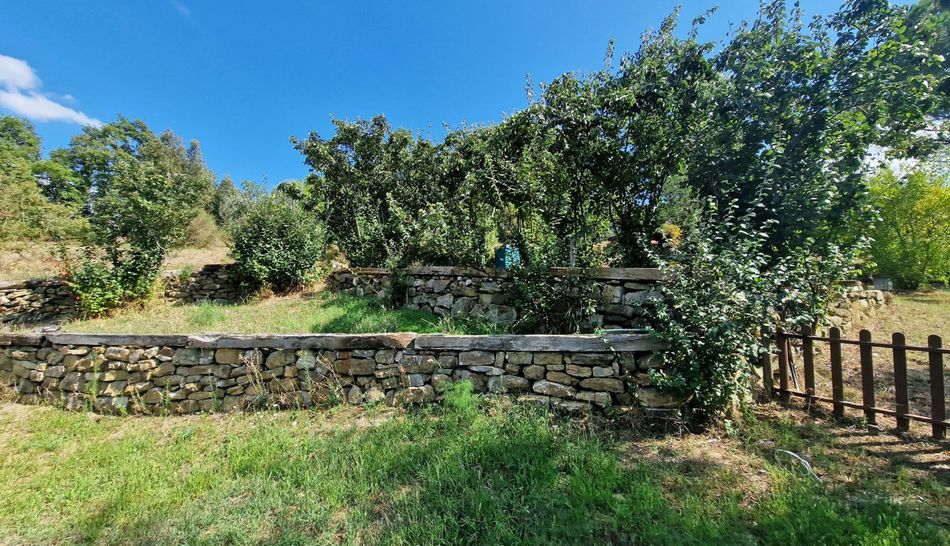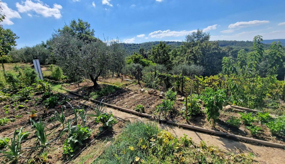 The property is surrounded by 13 hectares of land, consisting of 4 hectares of olive grove with approximately 400 trees in production and 3 hectares of arable land, while the remainder is woodland.