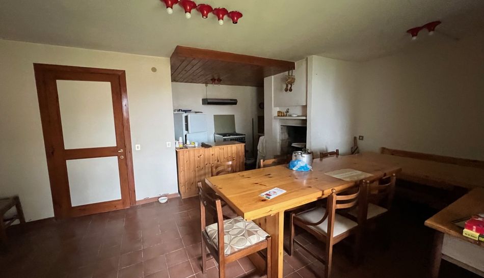 Il fabbricato necessita di ristrutturazione e attualmente e' cosi suddiviso: ampia sala con camino, soggiorno/cucina, due camere, corridoio, bagno e terrazzi al piano terra.