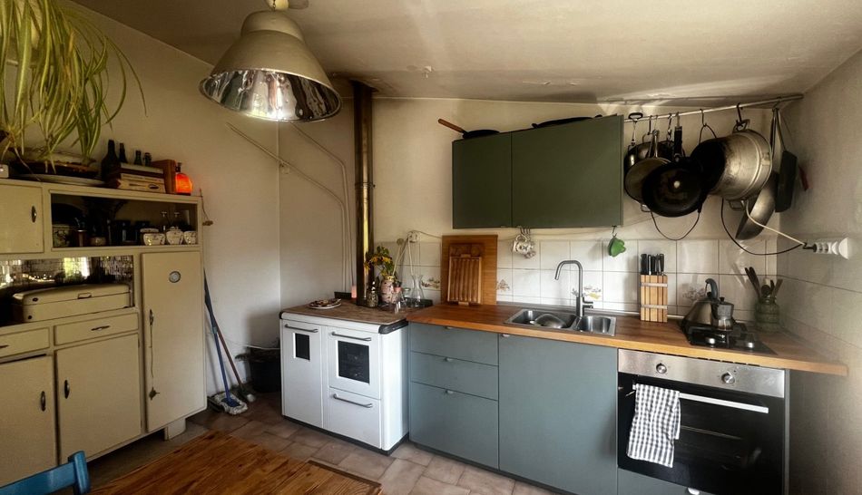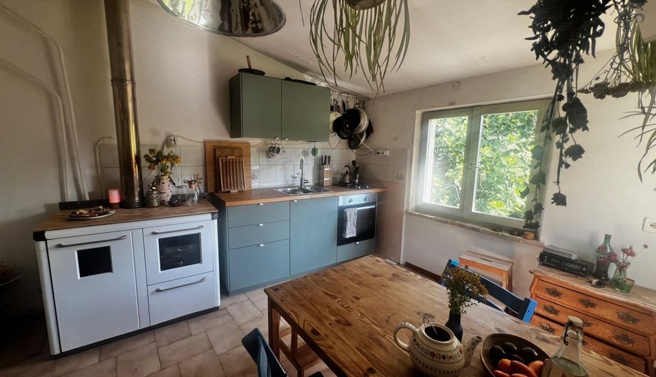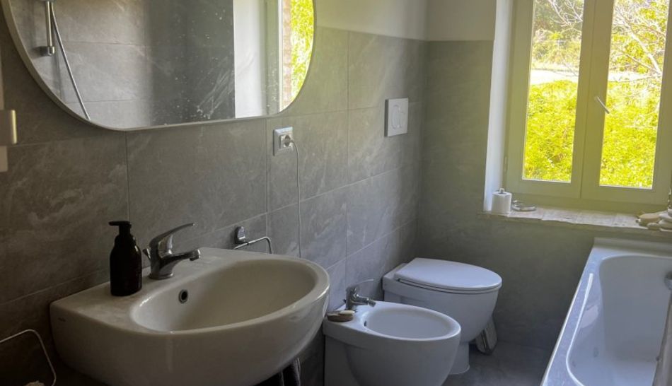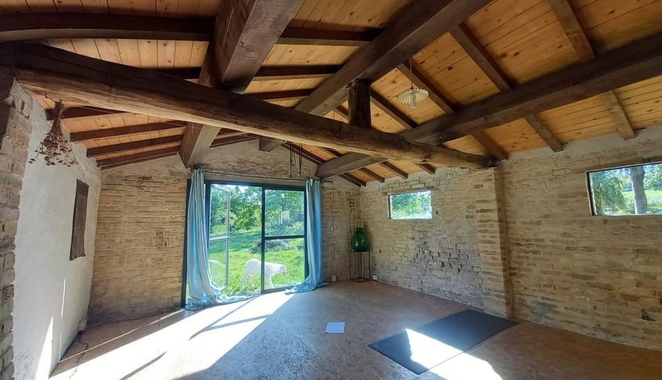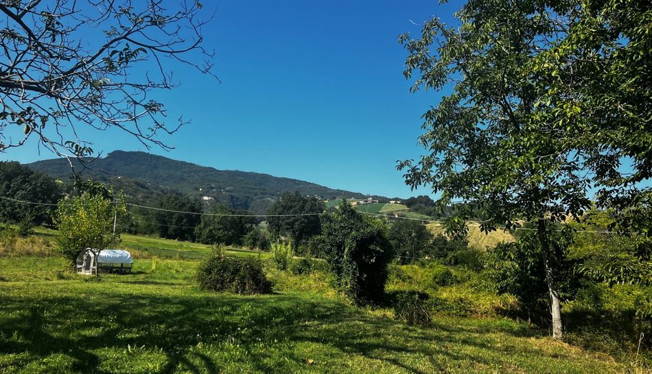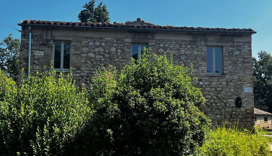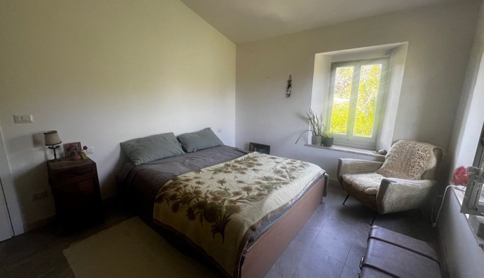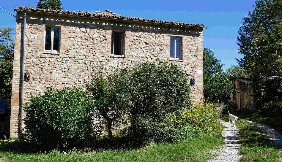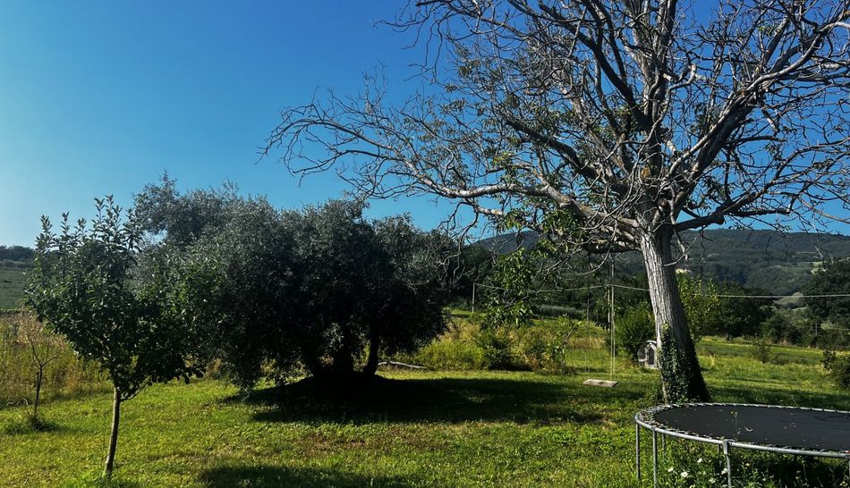 L'ampio terreno pianeggiante che circonda la casa comprende un fienile, una sala yoga e un vecchio fienile. Ci sono molti alberi, sia grandi che piccoli, tra cui alberi da frutto come fichi e noci, piante perenni, aiuole e ulivi. La restante parte dei circa 6,6 ettari di terreno, di cui circa 4 ettari a bosco e il resto a vocazione agricola, può essere acquistata separatamente.
