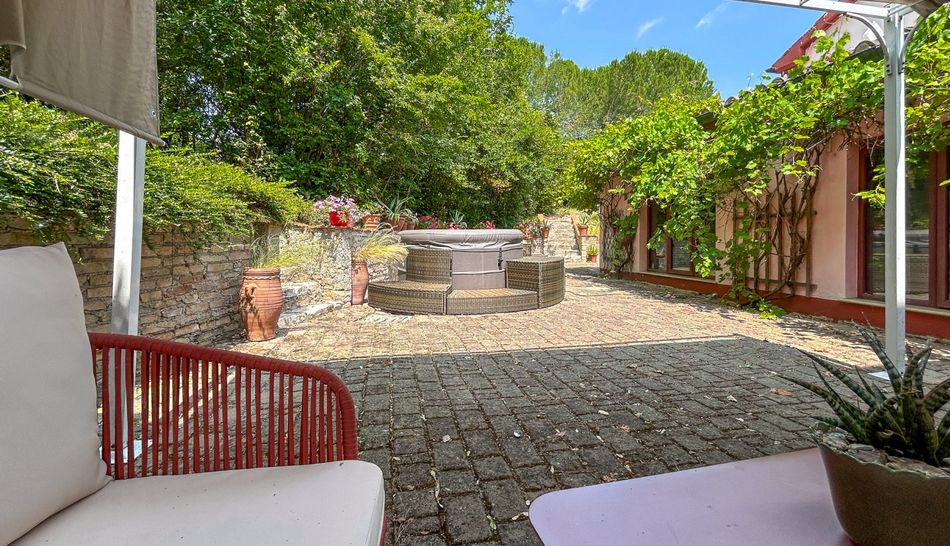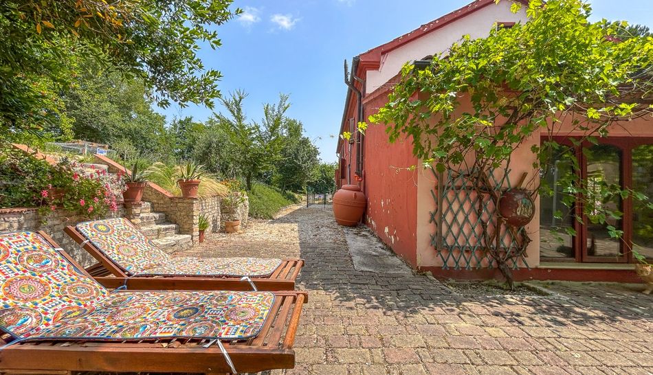 All'esterno, si trova un bellissimo giardino non recintato di circa un ettaro, con un pozzo funzionante che fornisce acqua in abbondanza, diversi alberi da frutto (melograno, limone, susino, pero e pesco), diversi ulivi, lavanda e rosmarino. Sono presenti anche una vasca idromassaggio e un'ampia veranda. La posizione garantisce sole tutto il giorno. Il sistema di drenaggio dell'acqua piovana parte dalla casa e verrà raccolto in una cisterna (attualmente in costruzione).