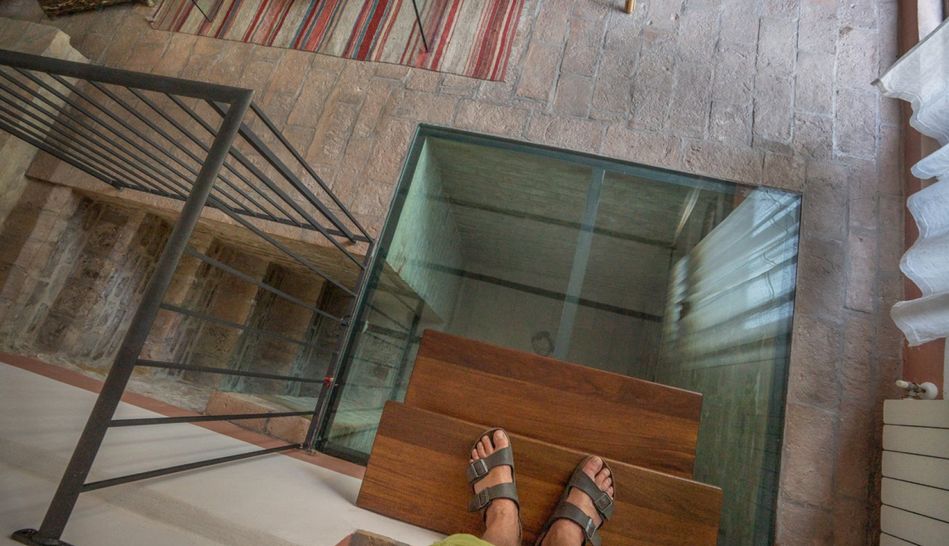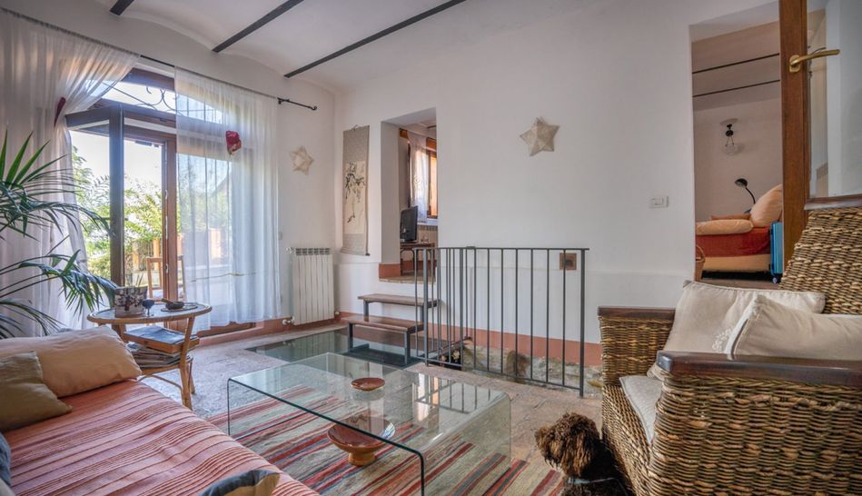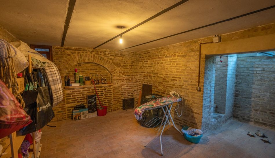 Nel seminterrato c'è una cantina dove le pareti sono rivestite con mattoni in terracotta. La luce filtra fino a questo livello dal pavimento di vetro sopra e da 2 piccole finestre sotto. Questa zona è perfetta per deporre il vino, la stiratura e la conservazione generale della casa