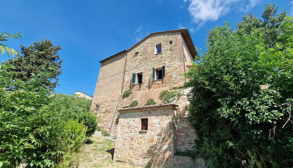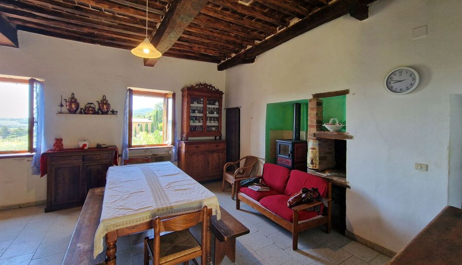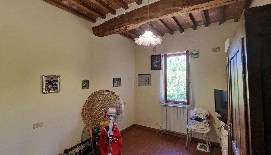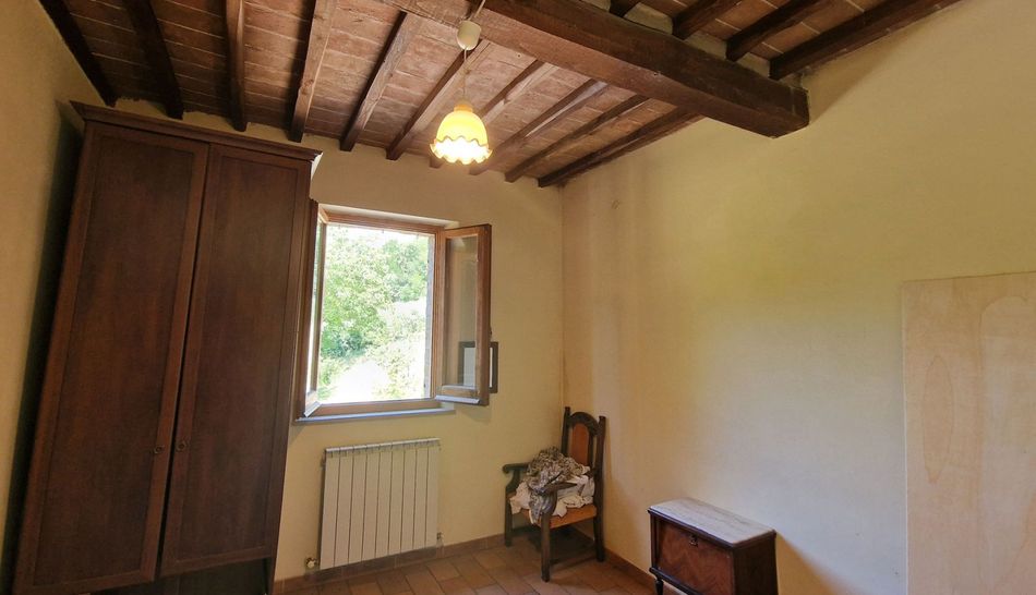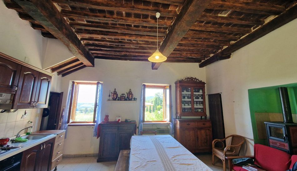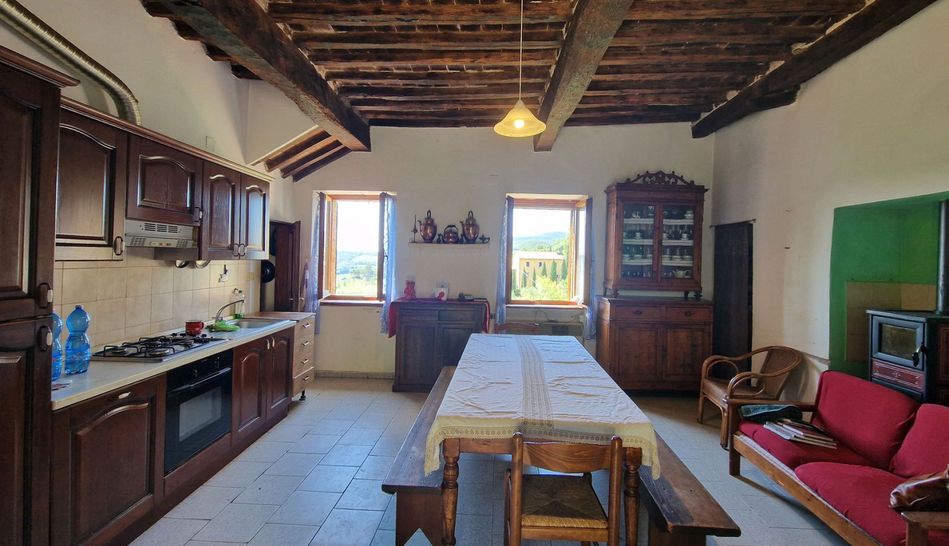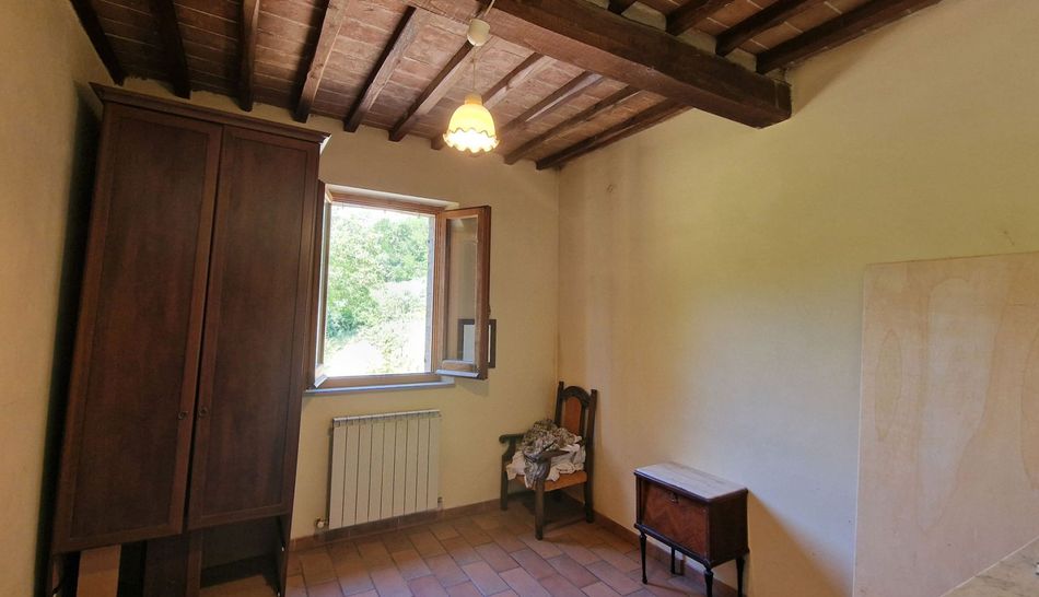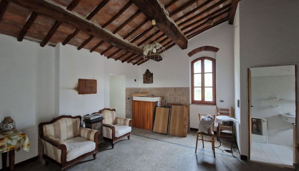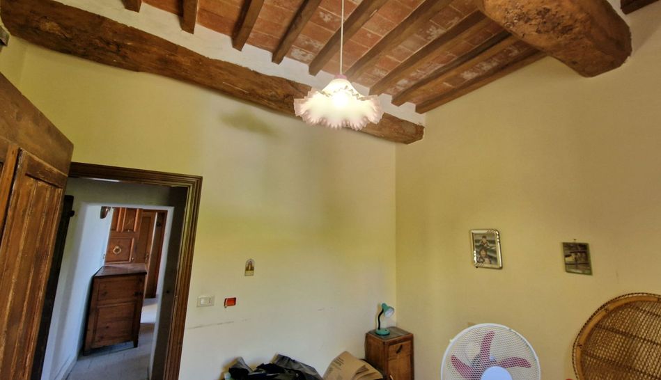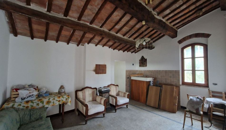 The property has the typical features of rustic Tuscan style, such as a stone facade, exposed wooden beams and terracotta floors. The house is habitable, although it needs some renovation work.