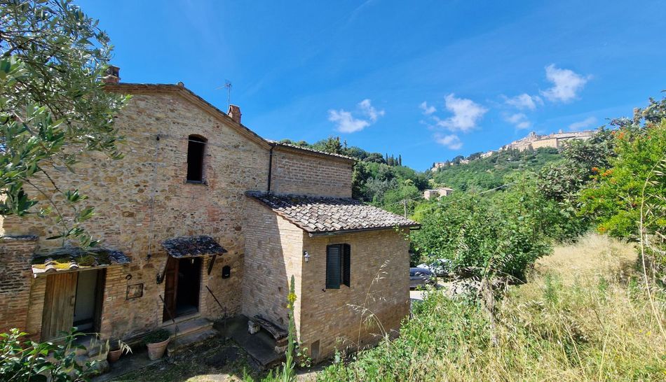 This typical Tuscan stone farmhouse is for sale a short walk from the historic centre of Montepulciano, a medieval town surrounded by vineyards and known for its red wine, Nobile di Montepulciano.